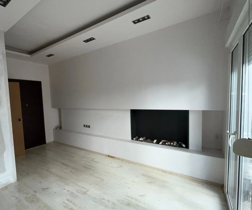 The property has undergone partial renovation, which includes aluminum window frames, radiator units, tiling, false ceilings, a fireplace, and security doors.